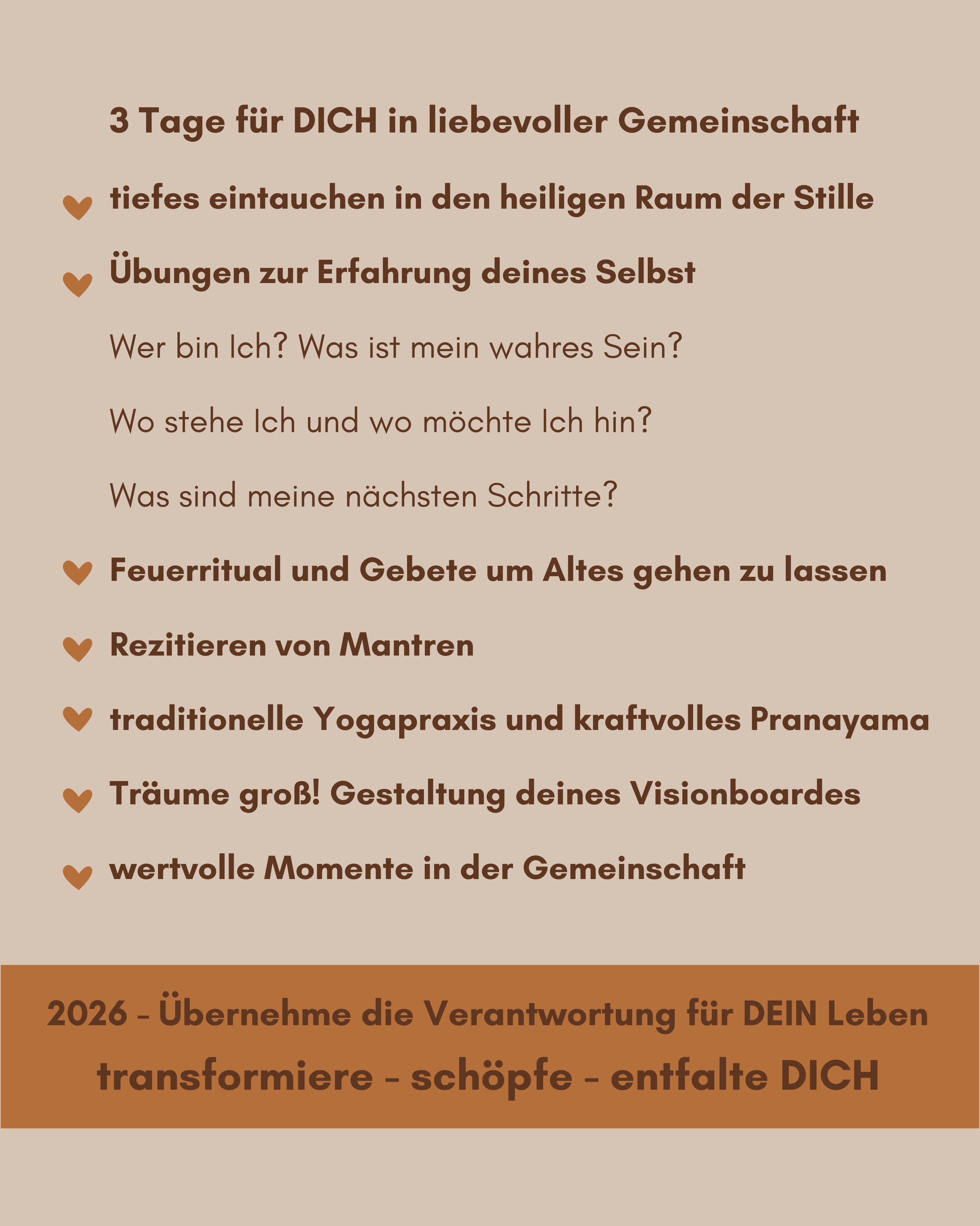 Unser Neujahrs-Retreat 2026 lädt dich ein, vollkommen in Dein Sein einzutauchen, dir über deine alten Glaubenssätze bewusst zu werden und diese zu wandeln, deine wahre Schöpferkraft zu erkennen und Verantwortung für dein neues ICH zu übernehmen.