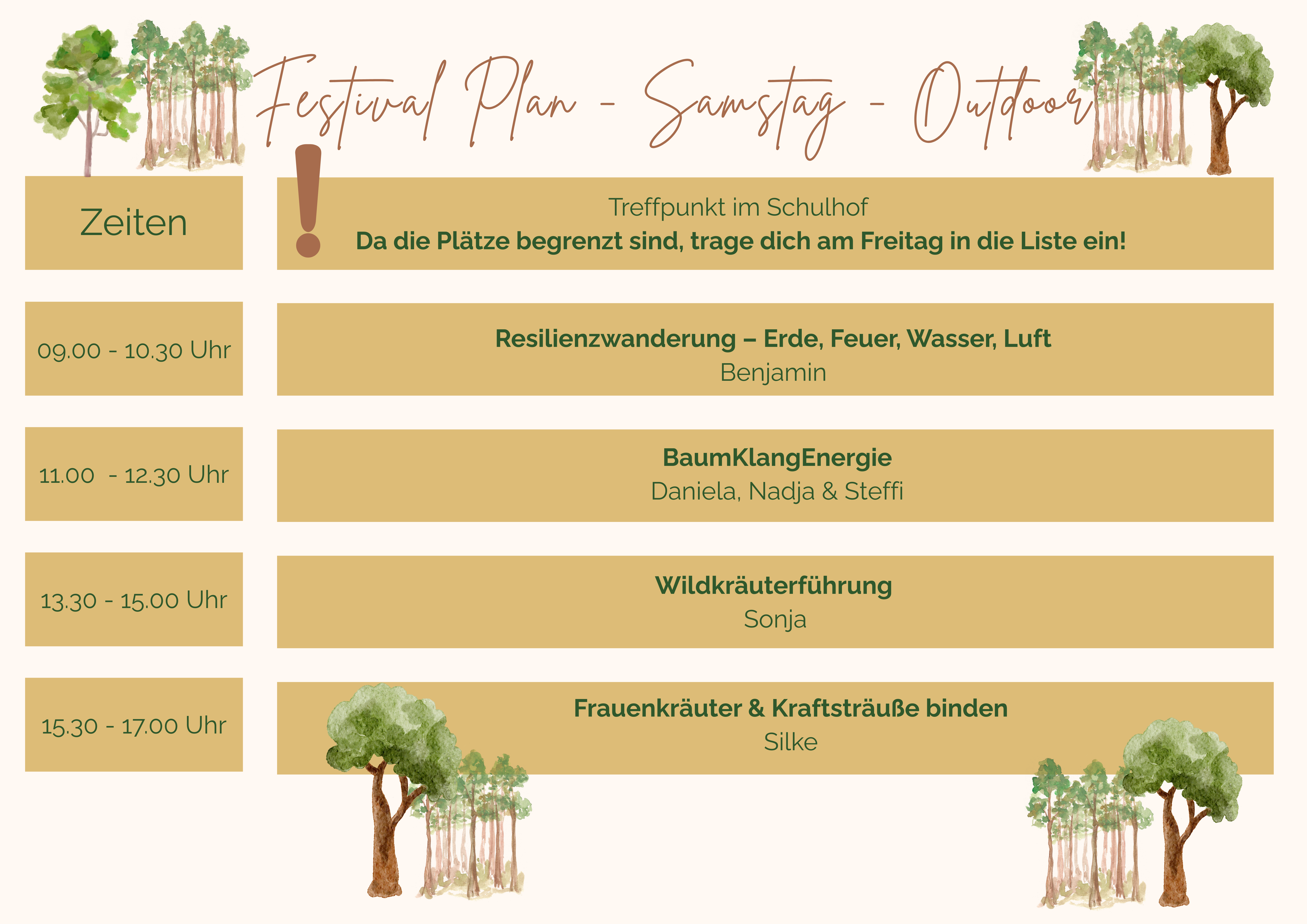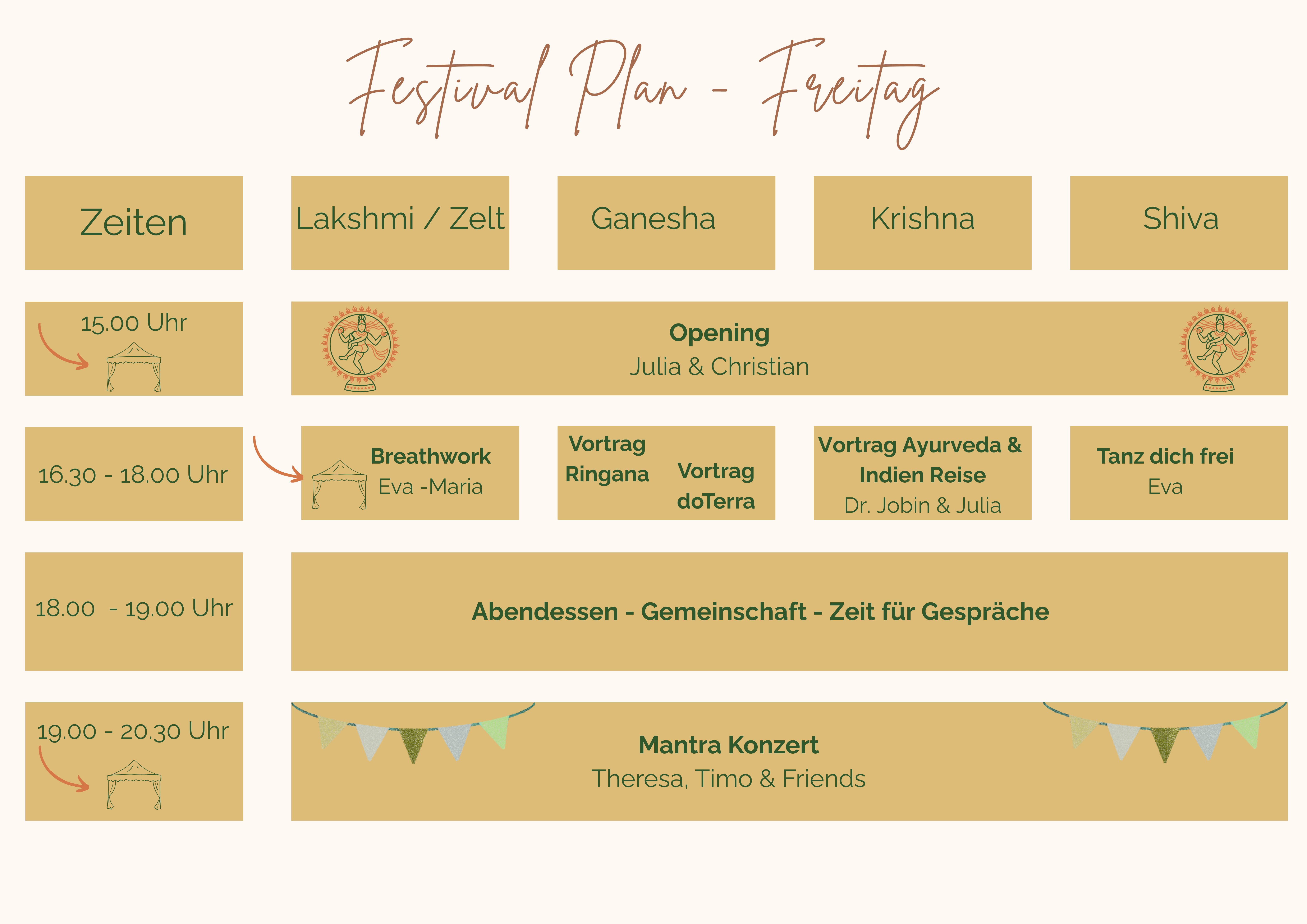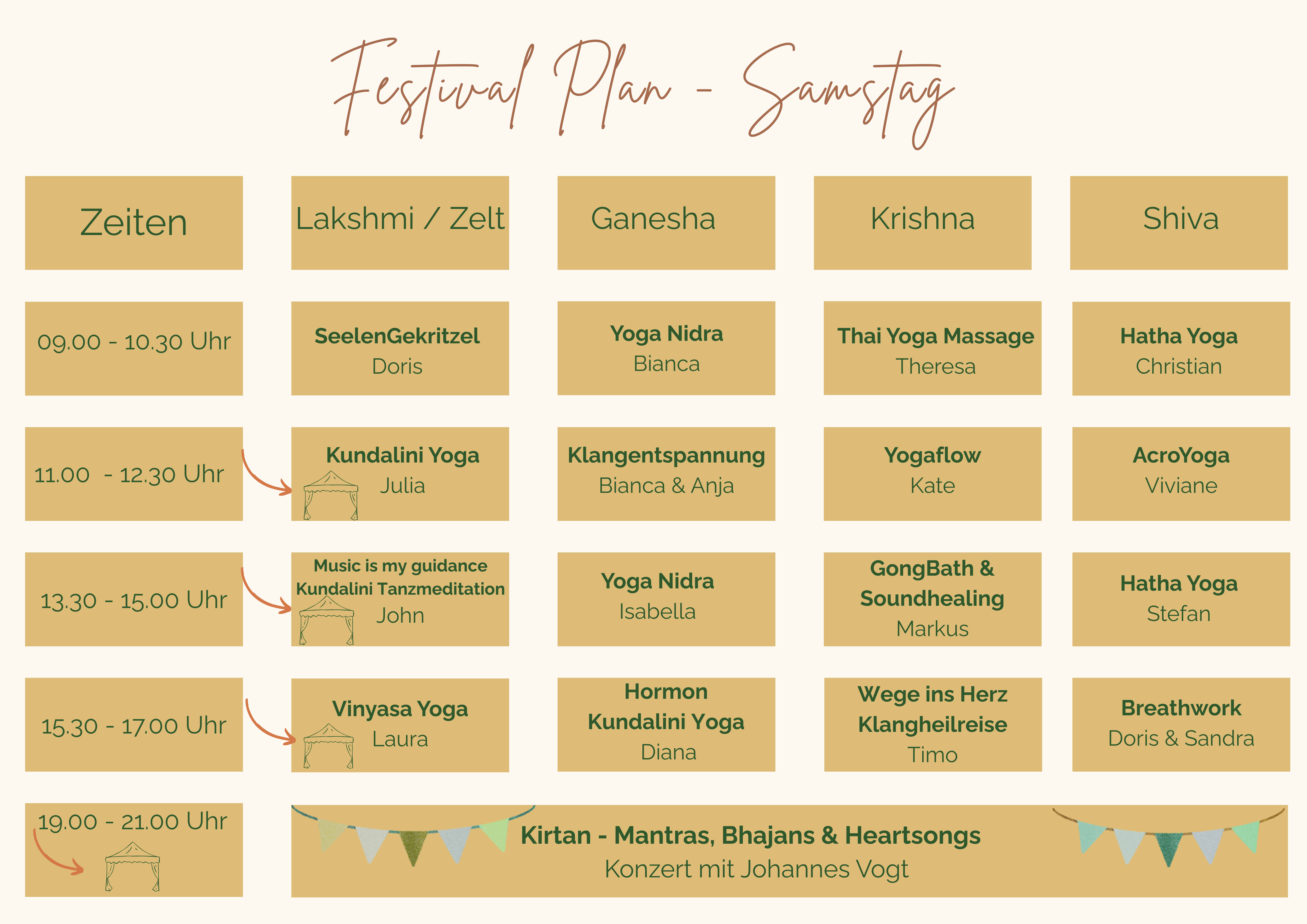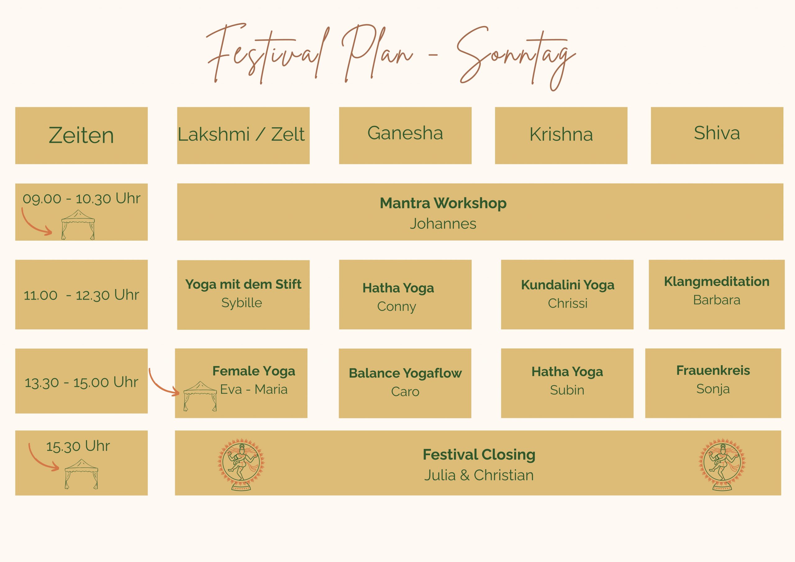 Die einzelnen Yogaklassen, Workshops und Programmpunkte werden wir dir am Freitag zur Eröffnung genauer vorstellen.